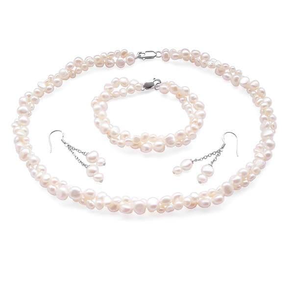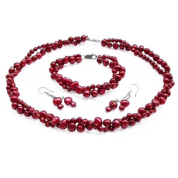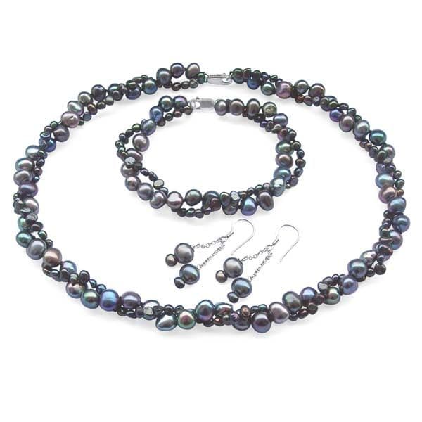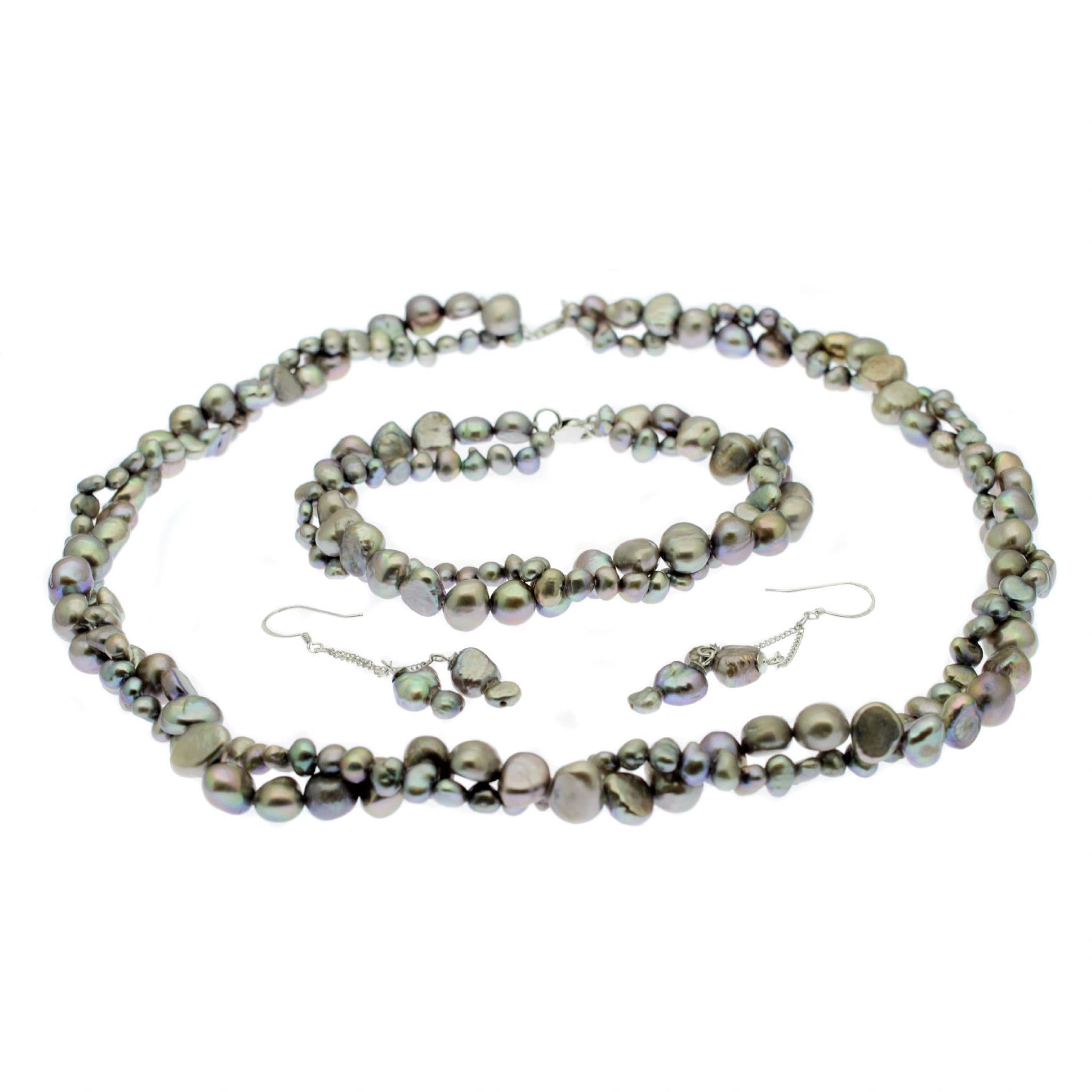 Pearl Set, Necklace, Bracelet & Earrings - Double Baroque - Sterling Silver - White Grey Black Red